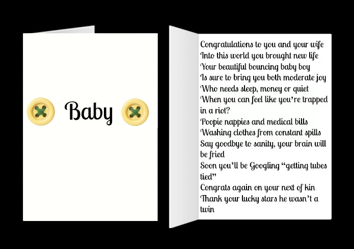 The baby card is my favorite. This is probably not an enormous surprise to you. But I loved the whole post. I sincerely hope that isn’t surprising, either.